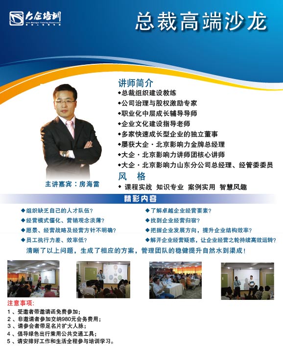 對(duì)象: 年?duì)I業(yè)額千萬(wàn)以上的企業(yè)董事長(zhǎng)、總裁、總經(jīng)理