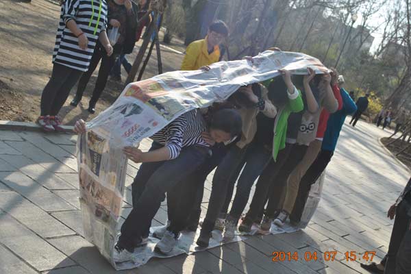 在飯后,由黃總給我們帶來了拓展活動——無敵風(fēng)火輪,在伙伴們組成的兩組制成的報紙履帶,伙伴們在里面行走,過程很是曲折,但是沒有一個人放棄,伙伴們都紛紛發(fā)揚北影的團(tuán)結(jié)精神,堅持到底,永不放棄!在活動的同時,吸引了很多路人的目光,還有許多人詢問我們是哪家公司的,都露出了贊許的目光。
