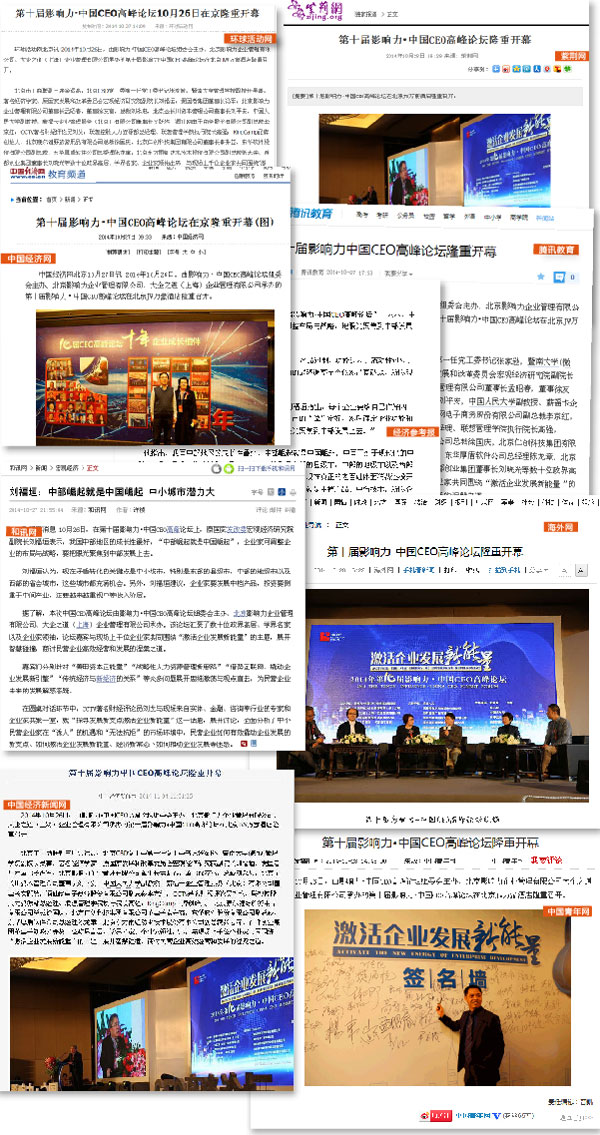 影響力•中國CEO高峰論壇創(chuàng)辦于2005年10月,迄今已經(jīng)圓滿舉辦了十屆,成為大企培訓(xùn)的標(biāo)志性品牌活動,每屆論壇強(qiáng)大的嘉賓陣容、鮮明的議題、極具實戰(zhàn)性的內(nèi)容獲得了業(yè)界的高度關(guān)注與廣泛參與,同時也感謝環(huán)球活動網(wǎng)、和訊網(wǎng)、中國青年網(wǎng)、騰訊教育、中國經(jīng)濟(jì)網(wǎng)、海外網(wǎng)、中國搜索、紫荊網(wǎng)、商務(wù)時報、中國經(jīng)濟(jì)時報、環(huán)球時報、新華社《經(jīng)濟(jì)參考報》、京華時報、《現(xiàn)代企業(yè)文化》雜志等媒體對本屆論壇的大力支持和報道。