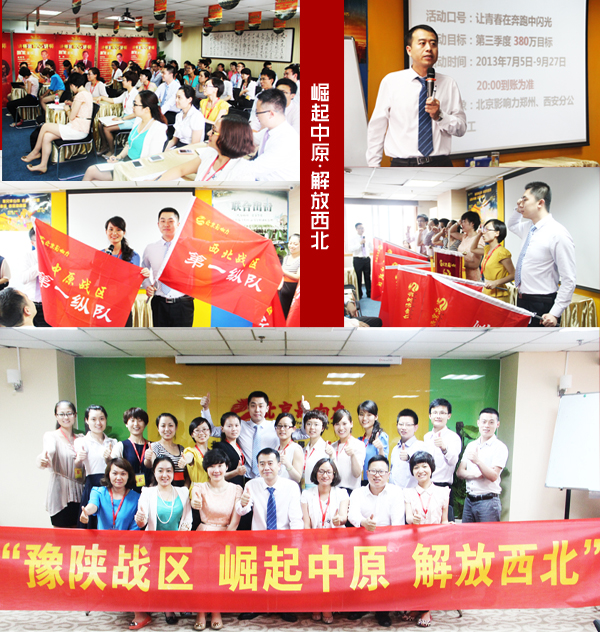 戰(zhàn)區(qū)特色:京津內(nèi)部劃分為五大戰(zhàn)區(qū)14大團(tuán)隊(duì),榮勝隊(duì)伍將獲得“飛鷹戰(zhàn)隊(duì)”稱號(hào)。為確保最終目標(biāo)的順利達(dá)成,京津戰(zhàn)區(qū)按月份進(jìn)行階段性評(píng)估,分定目標(biāo),逐個(gè)達(dá)成。同時(shí),本著互幫互助的原則,由兩家公司銷售管理者定期進(jìn)行經(jīng)驗(yàn)交流與分享。兩戰(zhàn)區(qū)相互協(xié)調(diào)配合,充分發(fā)揚(yáng)了北京影響力的團(tuán)隊(duì)精神。
